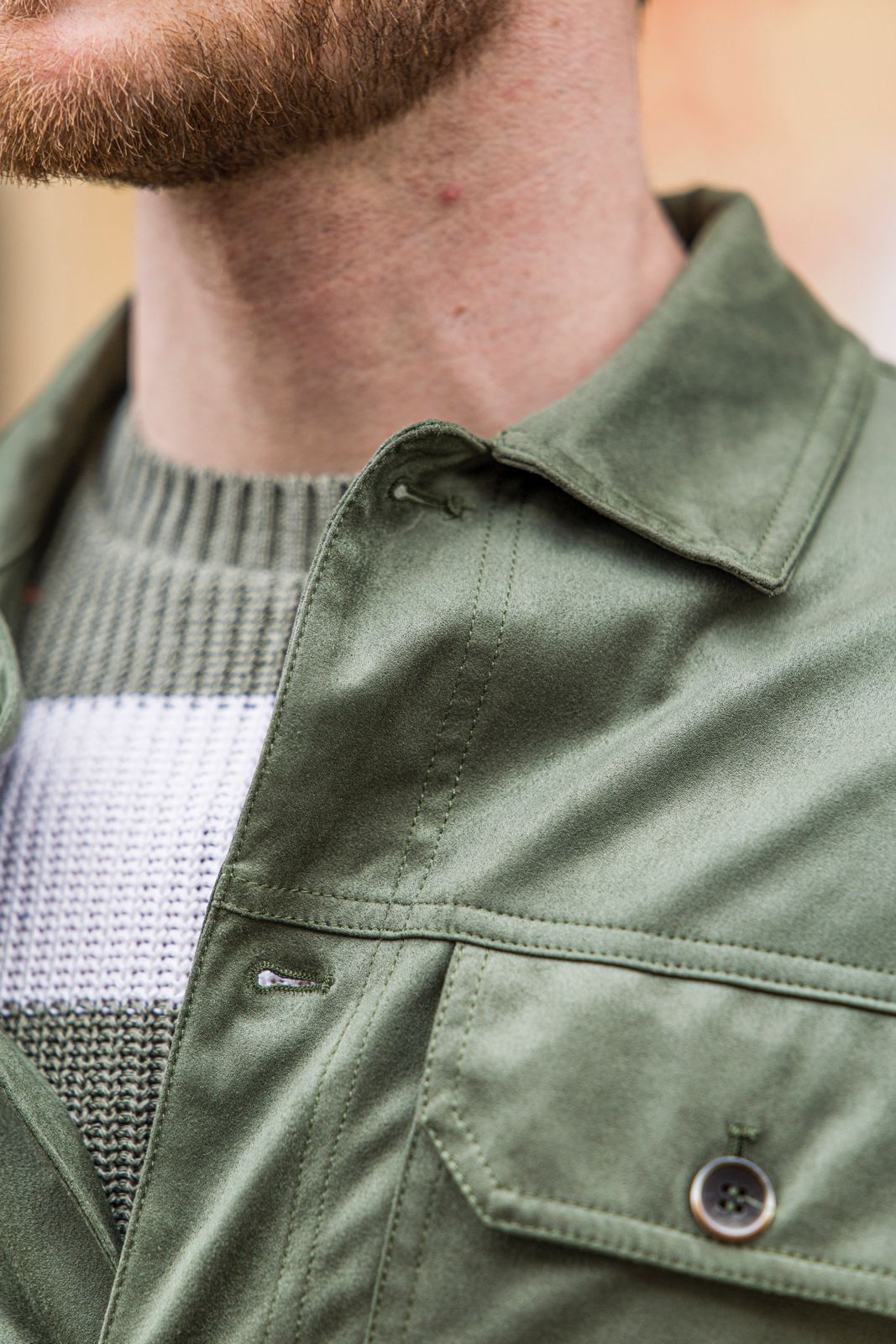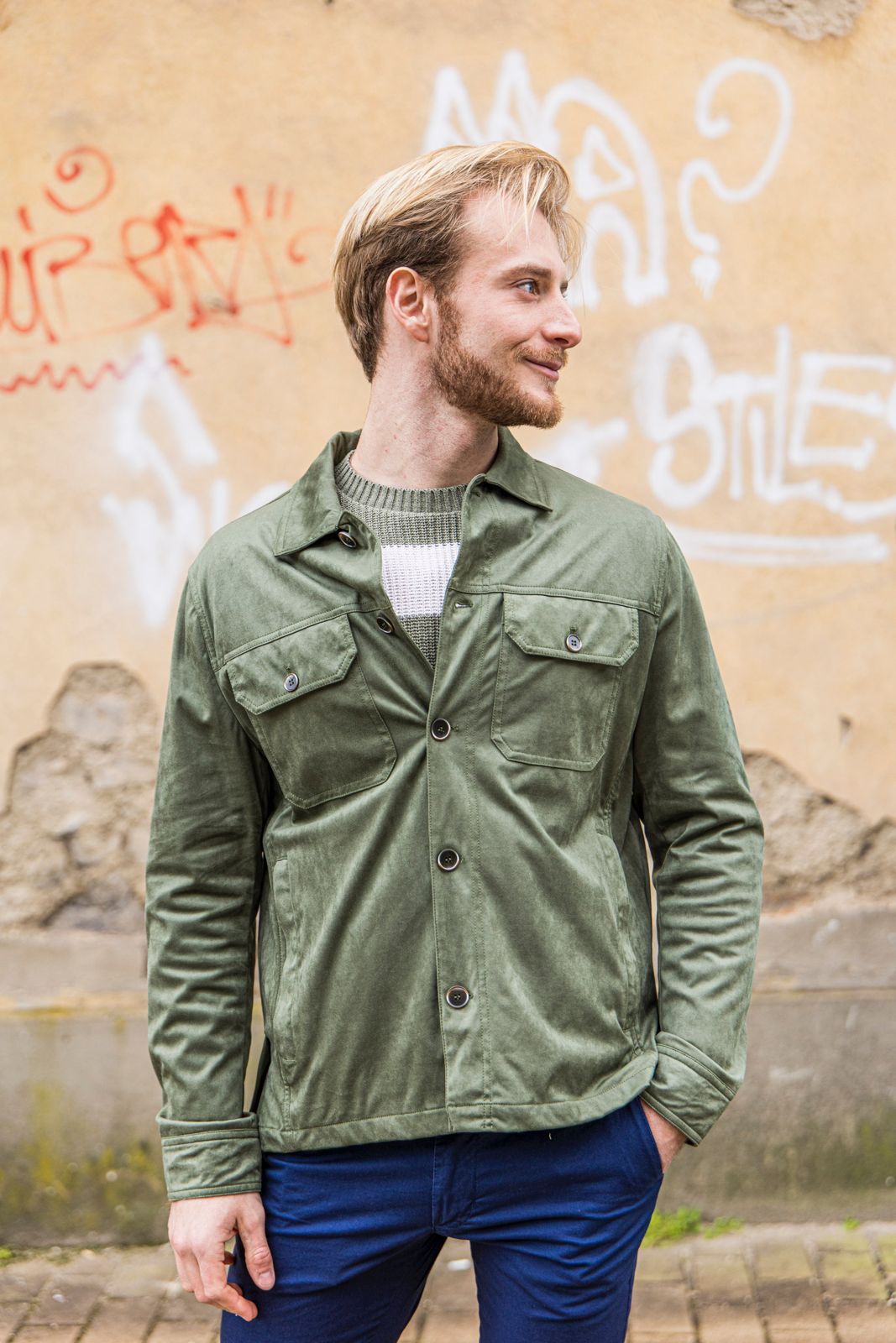 Giubbotto in overshirt in ecocamoscio con tasca in petto e chiusura con bottoni.